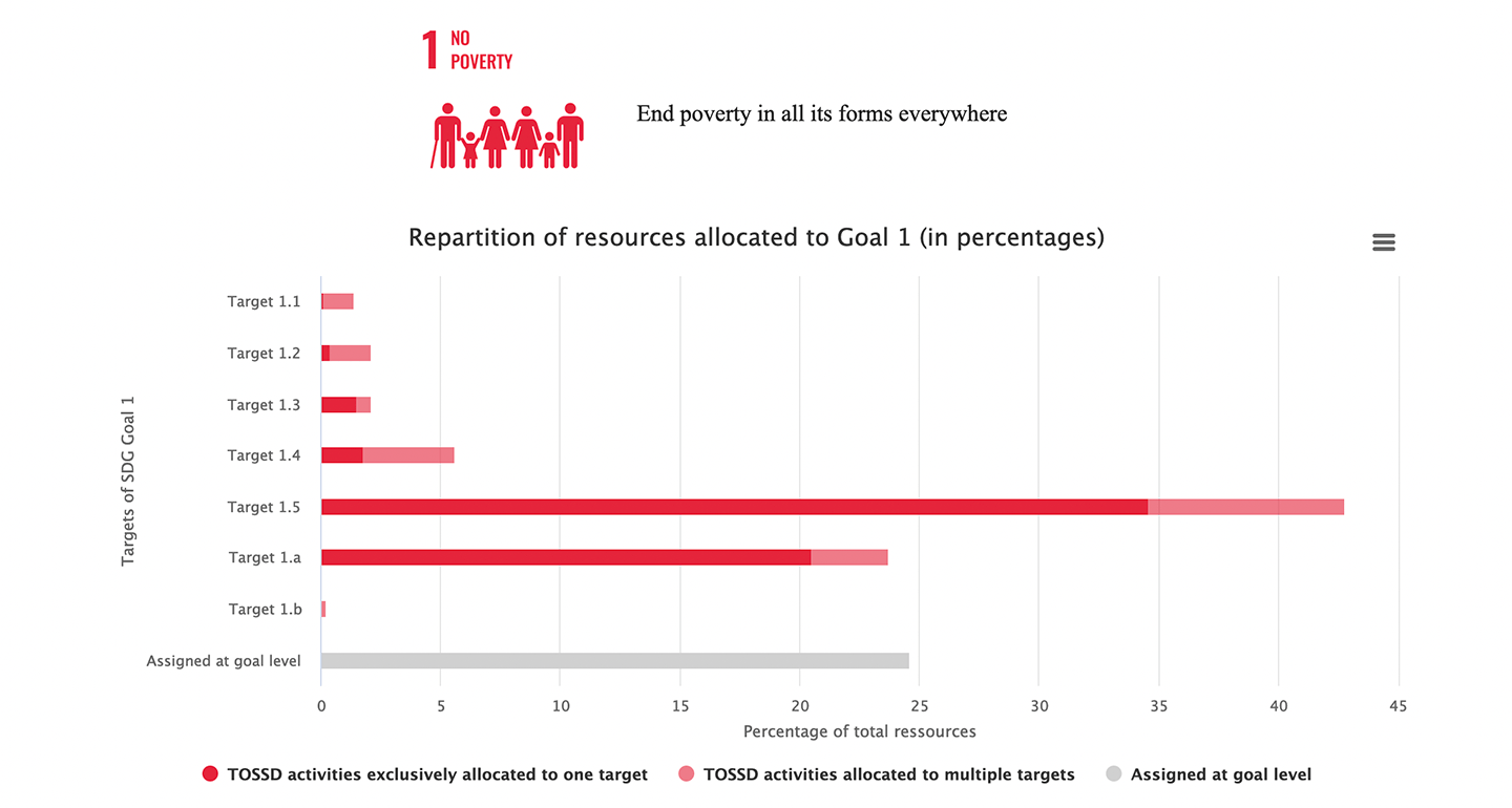 - SDG data are presented exclusively as shares, and not in absolute amounts. The shares represents the percentage of resources allocated to each sustainable development goal, over the total resources allocated. Each TOSSD activity could be reported with more than one SDGs or target, therefore the sum of the shares for all SDGs is higher than 100%.